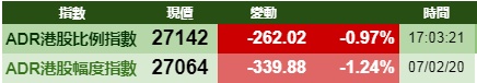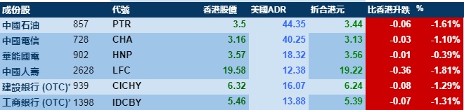 智通财经APP获悉,周五,美股三大指数收跌,港股ADR指数依旧弱势,按比例计算,收报27142点,跌262.02点或0.97%。大型蓝筹全线受压,汇丰控股(00005)收报57.92港元,较港收市升0.12港元;腾讯控股(00700)收报396.38港元,较港收市跌6.02港元。建设银行(00939)收报6.24港元,较港收市跌0.08港元;工商银行(01398)收报5.39港元,较港收市跌0.07港元。