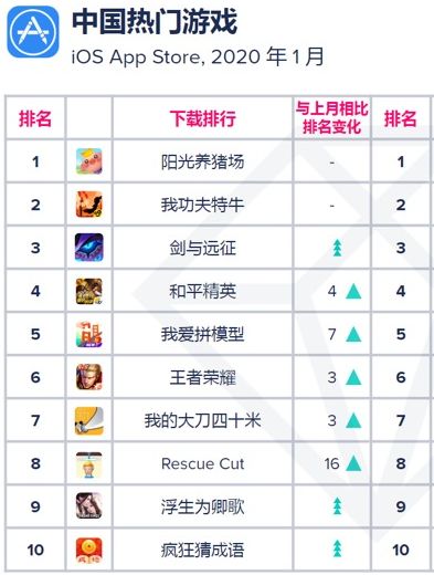 1月中国iOS下载榜中,前两名的位置依旧被《阳光养猪场》和《我功夫特牛》所占据,而这主要归功于其投放力度的不断加大。据统计,近30天买量投放前两名得主也同样是《阳光养猪场》和《我功夫特牛》,素材数均超5000。排名第3的《剑与远征》也同样是买量大户。