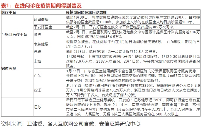 国家充分肯定了互联网医疗的重要作用。《通知》充分肯定了互联网医疗的重要作用,明确提出“要充分发挥互联网医疗服务优势,大力开展互联网诊疗服务,特别是对发热患者的互联网诊疗咨询服务,进一步完善“互联网+医疗健康”服务功能”。此前也同样强调了互联网诊疗咨询服务的重要性。政府的密集政策利好有望成为互联网医疗行业发展的助推器。