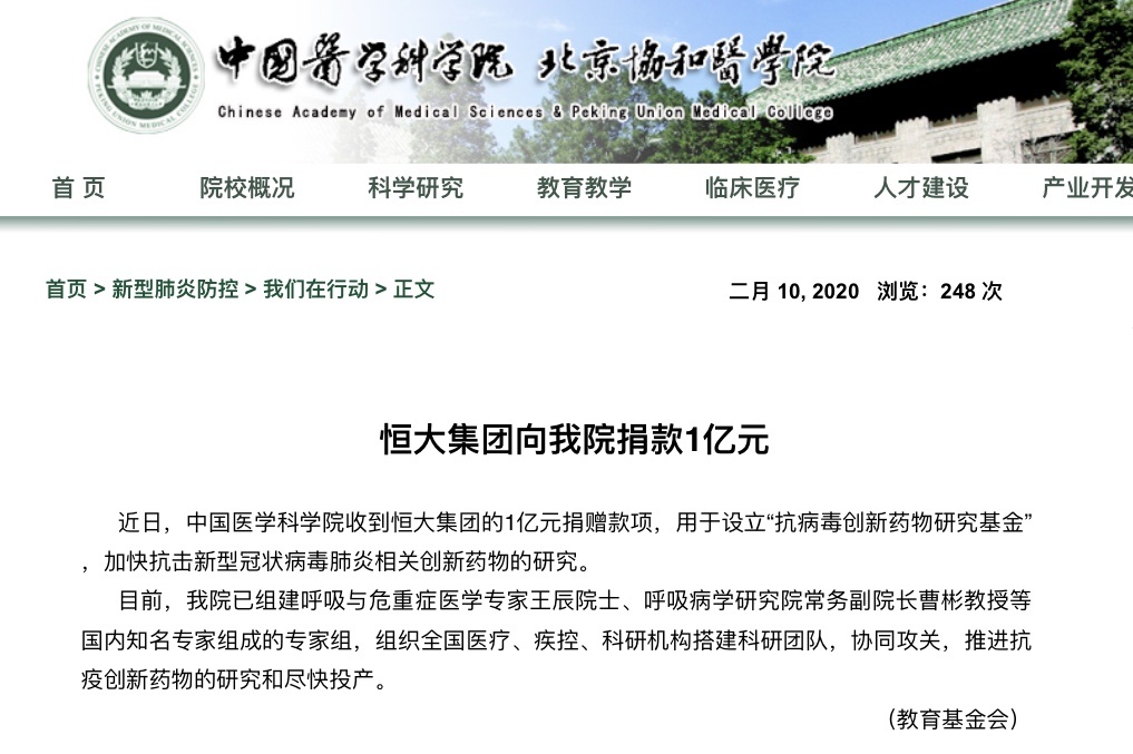 智通财经APP获悉,记者从中国医学科学院官网获悉,恒大集团(03333)于近日向中国医学科学院现金捐赠1亿元,支持设立“抗病毒创新药物研究基金”,用于加快抗击新冠肺炎相关创新药物的研发。