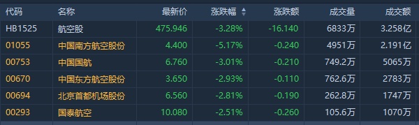 智通财经APP获悉,航空股上周小幅反弹,近日盘中再度走弱。截至发稿,南方航空(01055)跌5.17%,报4.4港元;中国国航(00753)跌3.16%,报6.75港元;东方航空(00670)跌2.93%,报3.65港元;首都机场(00694)跌2.52%,报6.58港元;国泰航空(00293)跌2.51%,报10.08港元。