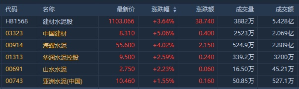 截止发稿,中国建材(03323)涨4.68%,报8.28港元;海螺水泥(00914)涨3.65%,报55.4港元;华润水泥(01313)涨2.59%,报9.5港元;山水水泥(00691)涨2.23%,报2.75港元。
