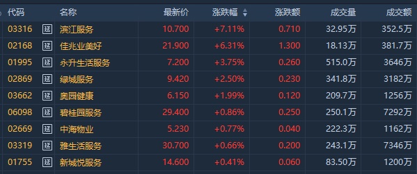 物管股午后上扬,截至发稿,佳兆业美好(02168)涨4.85%,报21.6港元;永升生活服务涨4.47%,报7.25港元;绿城服务(02869)涨2.39%,报9.41港元;奥园健康(03662)涨1.16%,报6.1港元。