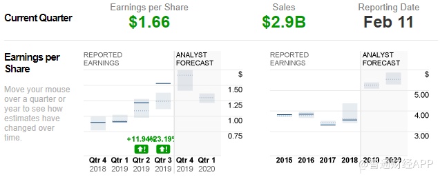 市场普遍预计公司第四季度营收为29.2亿美元,同比增长3.5%;预计每股收益为1.66美元,同比增长84.4%。此外,从2019年全年来看,公司预计Q4调整后运营利润介于17.4亿至17.7亿美元之间,而此前预期为16.4亿至17.7亿美元;预计调整后EPS位于5.25-5.75美元之间,高于此前预期的5-5.5美元。