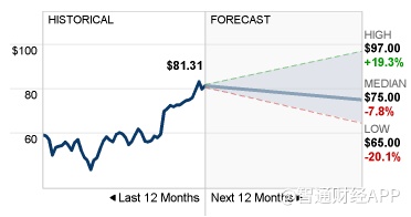 股价上,11位分析师预计该公司在未来12个月内的股价预估中值为75美元,最高97美元,最低65美元。然而,该预估中值较上次的81.34美元下滑了7.79%。