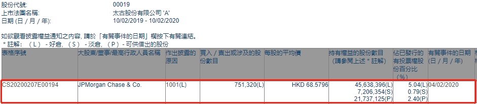 智通财经APP获悉,联交所最新资料显示,2月4日,摩根大通增持太古A(00019)75.132万股,每股作价68.5796港元,总金额约为5152.52万港元。增持后最新持股数目约为4563.84万股,最新持股比例为5.04%。