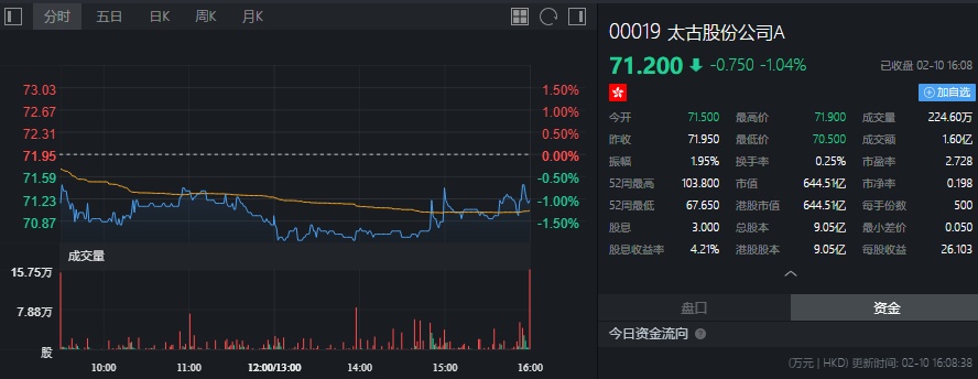 截至今日收盘,太古A(00019)跌1.04%,报71.20港元。