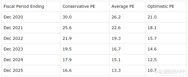 下图显示了公司的预期市盈率,主要包括华尔街分析师的最低收益预期,平均收益预期和最乐观收益预期。
