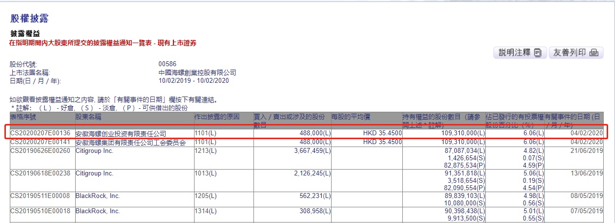 智通财经APP获悉,联交所最新资料显示,2月4日,安徽海螺创业投资有限责任公司增持海螺创业(00586)48.8万股,每股作价35.45港元,涉及总金额约为1729.96万港元。增持后最新持股数目约为1.09亿股,最新持股比例6.06%。