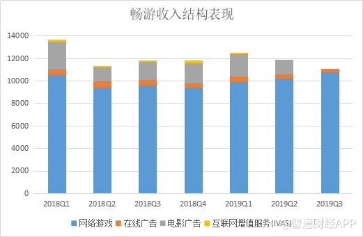 若从具体收入结构来看,畅游的收入目前主要来自于网络游戏和在线广告两个部分。其中,IVAS业务于2019年二季度停止;电影广告业务则随着业务经营主体上海晶茂申请破产一同终止。