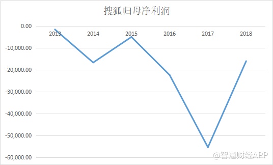 近年来,搜狐在亏损之路上越行越远。2013年以来,搜狐归母净利润均处于亏损状态,亏损规模于2017年达到最高点,于18年有所改善。受此影响,公司股价也随之一路下探,跌幅超过85%。