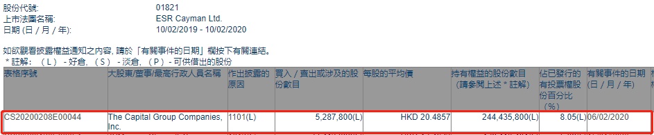 智通财经APP获悉,联交所最新资料显示,2月6日,The Capital Group增持ESR(01821)528.78万股,每股作价20.4857港元,总金额约为1.08亿港元。增持后最新持股数目约为2.44亿股,最新持股比例为8.05%。