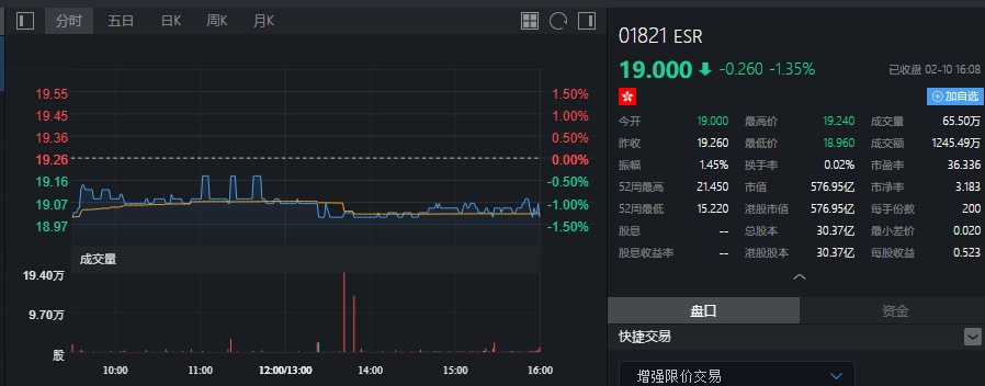 截至今日收盘,ESR(01821)跌1.35%,报19港元。