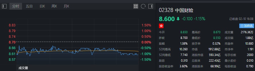 截至今日收盘,财险(02328)跌1.15%,报8.60港元。
