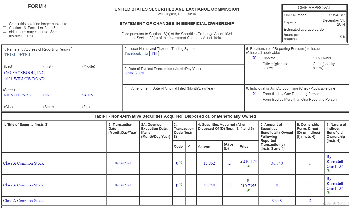 此次出售使得Thiel直接持有的Facebook股份仅剩9948股,他在2012年出售了大部分股份。