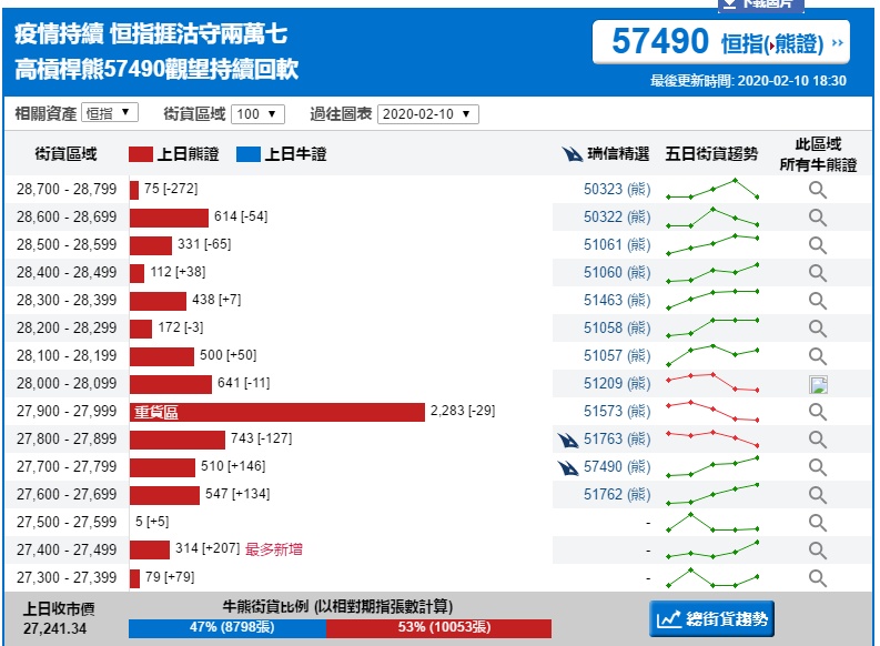智通财经APP获悉,截至2月11日,恒指最新的牛熊街货比例47:53。瑞信恒指牛熊证街货分布图中的数据显示,熊证街货重货区在27900-27999区间,该区间最新熊证数量为2283张,较上一交易日减少29张。最多新增在27400-27499区间,该区间最新熊证数量为314张,较上一交易日增加207张。牛证街货重货区在26000-26099区间,该区间最新牛证数量为769张,较上一交易日增加124张,同时该区间也是最多新增区间。