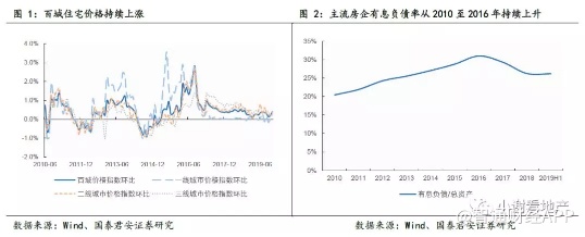 历史看,房价持续上涨,房企借助杠杆扩张。自2008年以来,地产行业经历了三轮周期,房价仅在2010年、2012年、2014年出现短期小幅度下跌,其余时期均上涨,且上涨幅度远大于下跌。对开发商而言,融资成本低于项目内涵回报率,加杠杆扩规模成为最优选择。从2010年至2017年影子银行监管前,主流房企有息负债占比从20%上升至31%。