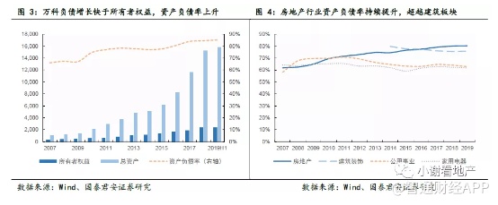 由于房企快速扩张主要由负债驱动,当前资产负债率已经达到高位。以始终处于行业前三的万科为例,资产负债率从2007年的66%上升至2019年年中的85%。这也是全行业的普遍状况,申万房地产板块资产负债率从2007年的62%上升到80%,超越建筑行业,成为负债率仅次于银行、非银的板块。