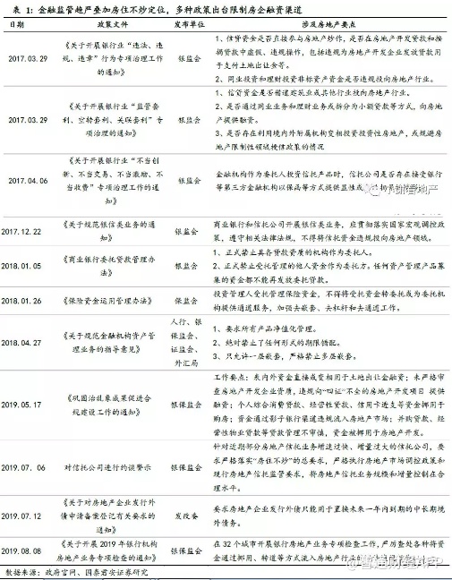 高杠杆引发监管收紧,融资渠道普遍受限。1)从2017年下半年起,在金融监管不断加强的背景下,一直游离于监管之外房企表外融资受到限制;2)在房住不炒的政策环境下,针对行业的政策调控也从之前的限购限售等方式,转变到更加侧重于金融调控的供给侧方式,2019年信托贷款、海外债等均收紧。我们认为对影子银行的监管和从供给侧对房地产进行的金融调控均具有持续性,房企融资渠道偏紧会是未来的常态。