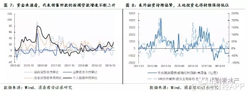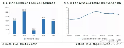 新监管环境下,无论是表内还是表外,2018年后房企融资难度增加。从信用债发行量来看,从2016年后,信用债发行量下行,考虑到2015年、2016年信用债的到期偿还,2018年、2019年实际净融资额更少。从衡量表外融资的信托贷款看,存量规模从2018年初开始下滑;2019年7月银保监会约谈房地产信托业务增速过快、增量过大的信托公司后,存量规模进一步下行。