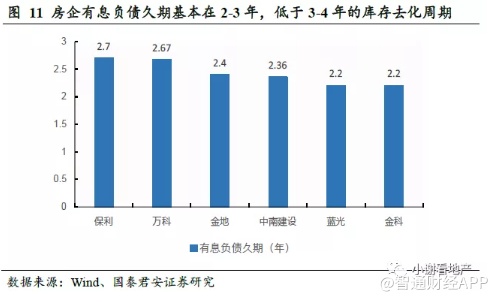 在负债端收缩过程中,资产端需要通过变现去匹配负债收缩,不能很好匹配将带来流动性压力。主流房企的负债久期基本在2-3年,头部房企保利、万科久期为2.7年、2.67年,中型民企负债久期较低,蓝光、金科仅有2.2年。而房企库存去化周期约3-4年,负债端收缩可能导致资产变现速度不及负债偿还速度,给房企带来流动性风险。