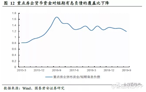 2019年以来房企流动性压力有所增加。A股重点监测34家房企货币资金对短期有息负债(短期借款+一年内到期长期负债)的覆盖比率2019年逐季下降,三季度末降至1.19,为近年最低水平。