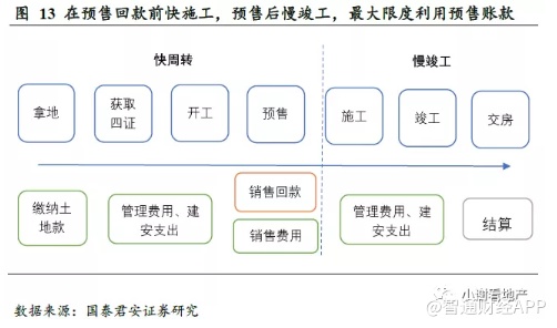 由于行业存在预售制,在有息负债收缩时,高周转、延长竣工时间成为对冲选择。房企从拿地到预售最快约6个月,而从预售到竣工交房约2-3年。从现金流角度看,房企在仅支付土地款和少部分建安支出的情况下,即可获得销售收入。高周转意味着更快地以土地和在建工程为抵押,从居民方获取预收账款;如果预售后相对放慢施工,可以延缓销售房屋的建安支出,最大限度的利用预售资金,对冲有息负债收缩影响。