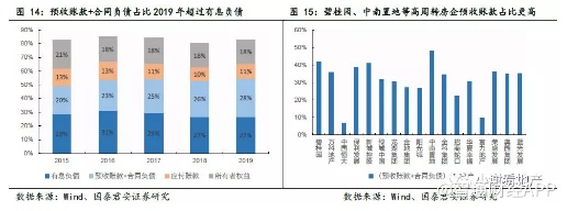 从资产负债表看,快周转意味着用更高比例的预收账款替代有息负债。如果房企加快周转,用销售回款去弥补有息负债,意味着房企的资金来源将偏重于预收账款。从房企资产负债表中看,2019年年中,主流房企预收账款占比已经达到28%,超过有息负债成为负债端最大的一项。快周转房企在这一过程中存在优势,碧桂园、中南置地等房企预收账款加合同负债占比超过40%