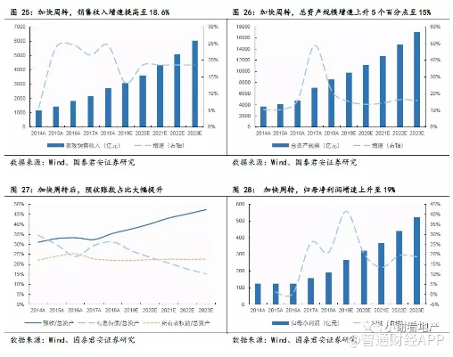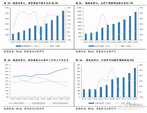 如果提高周转率,假设未售库存的去化周期从3年降至2.5年,则销售增速提高18.6%,同时预收账款占比提升。如果用提高周转率加无息杠杆对冲有息负债不增加带来的影响,去化周期降至2.5年,则土地投资强度可上升至48.8%,销售增速可保持在18.6%,有效提升7.4个百分点;总资产规模增速上升至15%左右,提升5个百分点。这种情况下,预收账款占总资产比例快速增加,每年约增加3个百分点,2023年达到47%。