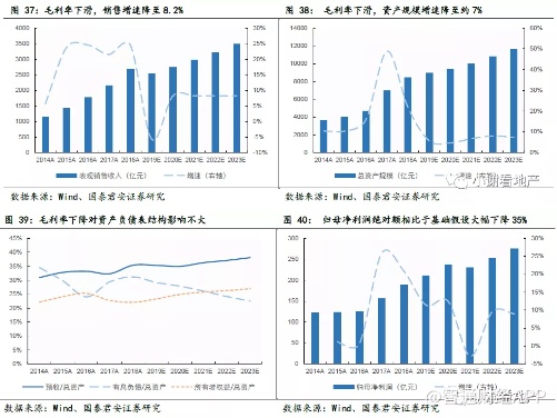 毛利率下滑5个百分点至27.5%,最高可维持8.2%的销售增速,归母净利润大幅下滑。保利历史毛利率总体较为稳定,均在30%以上。考虑到行业供给侧改革盈利收窄、公开市场地价上涨超过房价,如果毛利率下滑5个百分点至27.5%,则在有息负债不变的情况下,保利销售增速降至8.6%,对应的土地投资强度为43%。毛利率变动对资产负债表结构影响不大,但对盈利能力产生较大影响,相比于基础假设下滑约35%。
