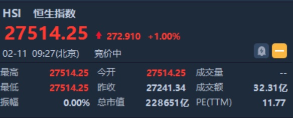 智通财经APP获悉,恒生指数开盘涨272.91点或1%,报27514.25点。国企指数涨0.96%,报10756.27点。红筹指数涨0.74%,报4335.44点。大市盘前成交32.21亿港元。