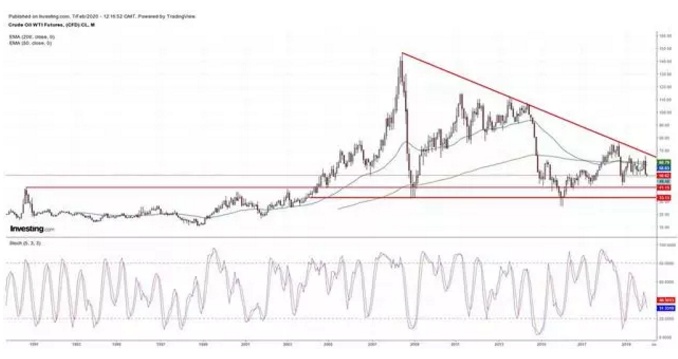 WTI原油合约可能已进入下一阶段的大幅下跌三角模式,预计未来几十年价格将大幅下跌。(编辑:刘瑞)