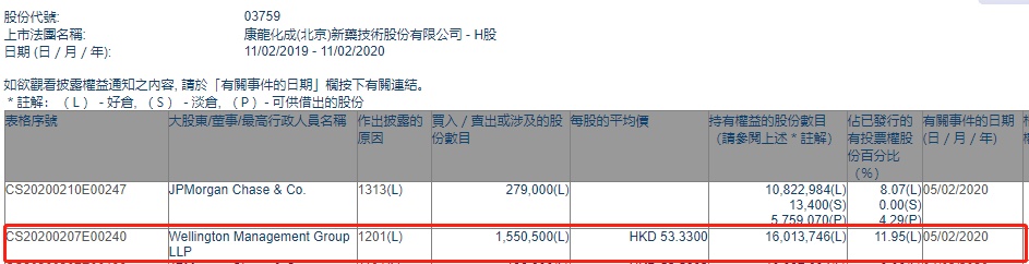 智通财经APP获悉,联交所最新资料显示,2月5日,Wellington Mgt Group减持康龙化成(03759)155.05万股,每股作价53.33港元,涉及总金额约为8268.82万港元。减持后最新持股数目约为1601.37万股,最新持股比例11.95%。