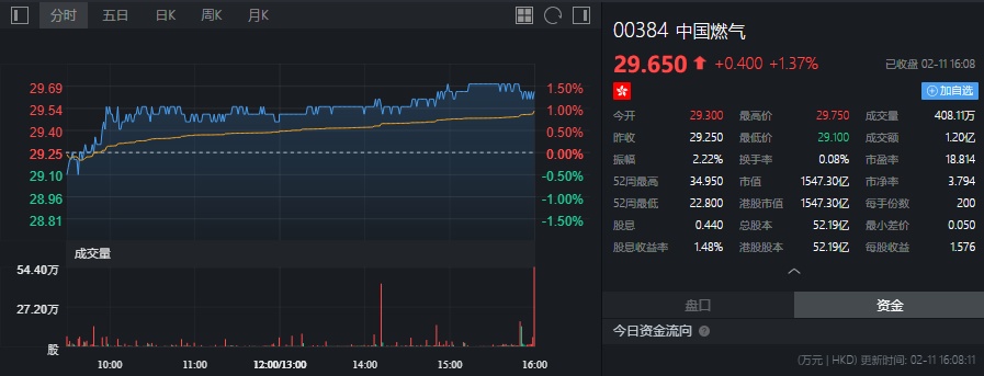 截至今日收盘,中国燃气(00384)涨1.37%,报29.65港元。