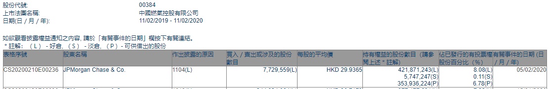 智通财经APP获悉,联交所最新资料显示,2月5日,摩根大通增持中国燃气(00384)约772.96万股,每股作价29.94港元,总金额约为2.31亿港元,增持后最新持股数目约为4.22亿股,最新持股比例为8.08%。