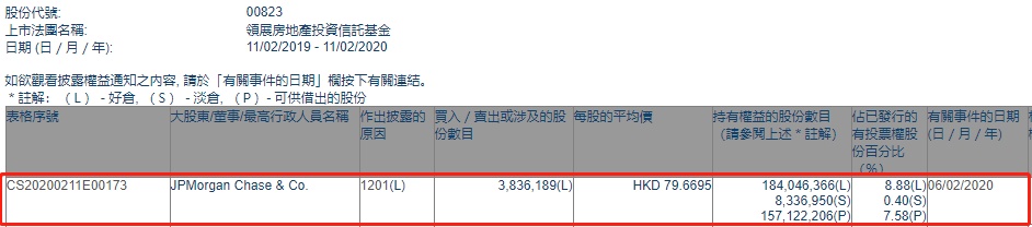智通财经APP获悉,联交所最新资料显示,2月6日,摩根大通减持领展(00823)383.6189万股,每股作价79.6695港元,涉及总金额约为3.06亿港元。减持后最新持股数目约为1.84亿股,最新持股比例8.88%。
