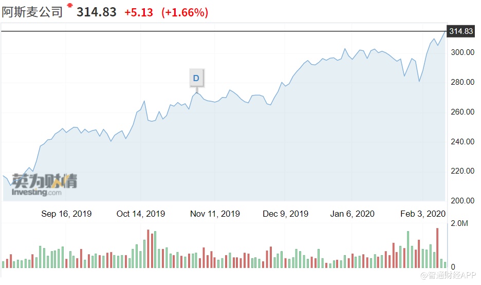智通财经APP获悉,2月11日(周二)美股盘初,全球最大的半导体设备公司阿斯麦(ASML.US)股价触及历史新高的316.27美元,截至北京时间23:27,该股涨1.66%,报314.83美元。目前该股总市值超过1325亿美元。