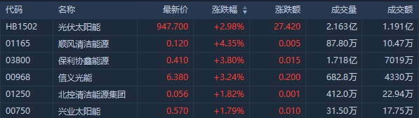 截至发稿,保利协鑫能源(03800)涨5.06%,报0.415港元;顺风清洁能源(01165)涨4.35%,报0.12港元;信义光能(00968)涨3.07%,报6.37港元;兴业太阳能(00750)涨1.79%,报0.57港元。