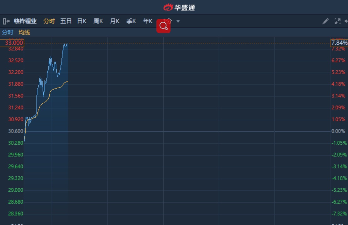智通财经APP获悉,全球氢氧化锂紧缺价格或将上涨,赣锋锂业(01772)延续涨势,截至10时16分,涨7.84%,报价33港元,成交额1.831亿。
