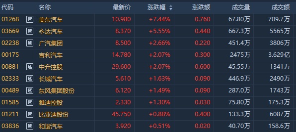 汽车股全线走强,截至发稿,美东汽车(01268)涨8.22%,报11.06港元;永达汽车涨5.55%,报8.37港元;广汽集团涨4.83%,报8.68港元;中升控股(00881)涨3.62%,报30.05港元;吉利汽车涨2.21%,报14.8港元。