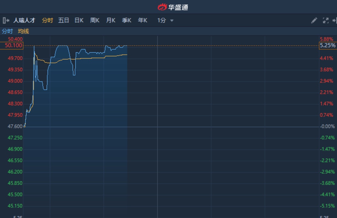 智通财经APP获悉,人瑞人才(06919)延续升势,近期股价连续破顶,盘中高见50.55港元,刷新上市新高,截至11时25分,涨5.25%,报价50.1港元,成交额1310万。