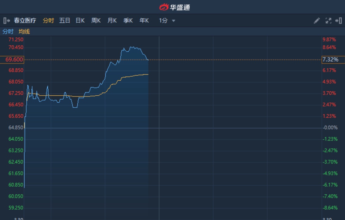 智通财经APP获悉,春立医疗(01858)盘中放量急升逾8%,高见70.55港元,刷新历史新高,截至11时47分,涨7.32%,报价69.6港元,成交额2671万。