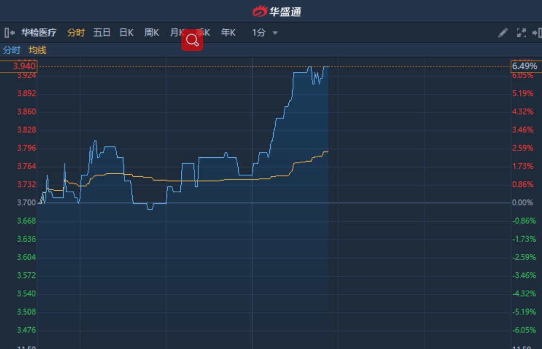 智通财经APP获悉,华检医疗(01931)午后直线拉涨逾6%,股价逼近历史新高。截至13时49分,涨6.49%,报价3.94港元,成交额594.7万。