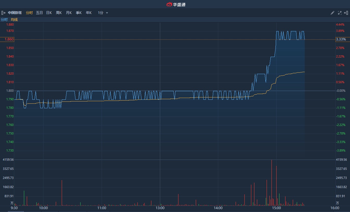 智通财经APP获悉,瑞信发表研究报告,中国铁塔(00788)将会受益于中联通及中国电信的5G室内频谱,该行维持其“跑赢大市”投资评级,目标价为2.55港元。而高盛发布报告称,考虑到对其盈利预测,上调其目标价2%,由2港元调高至2.04港元,维持“买入”评级。截至发稿,中国铁塔涨3.89%,报1.87港元,成交额7.57亿港元。