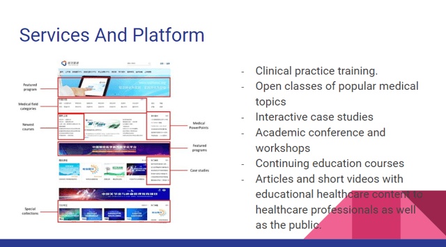 该公司为中国的医疗保健专业人员和公众提供医疗保健信息和培训服务。有关公司服务的更多详细信息,请参见下面的幻灯片: