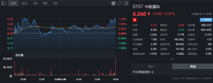 截至今日收盘,中联重科(01157)涨0.97%,报6.26港元。