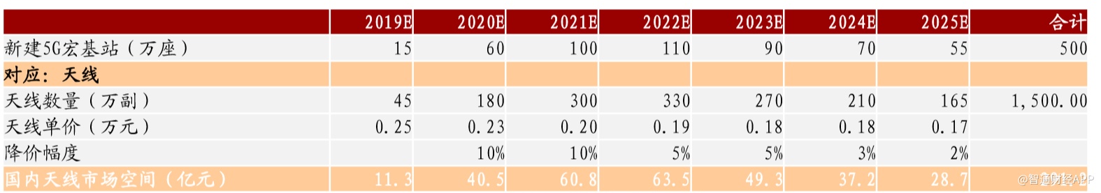 以基站天线市场为例,据招商证券数据显示,2019年时,预计新建的5G宏基站为15万座,对应的国内天线市场空间为11.3亿元人民币。