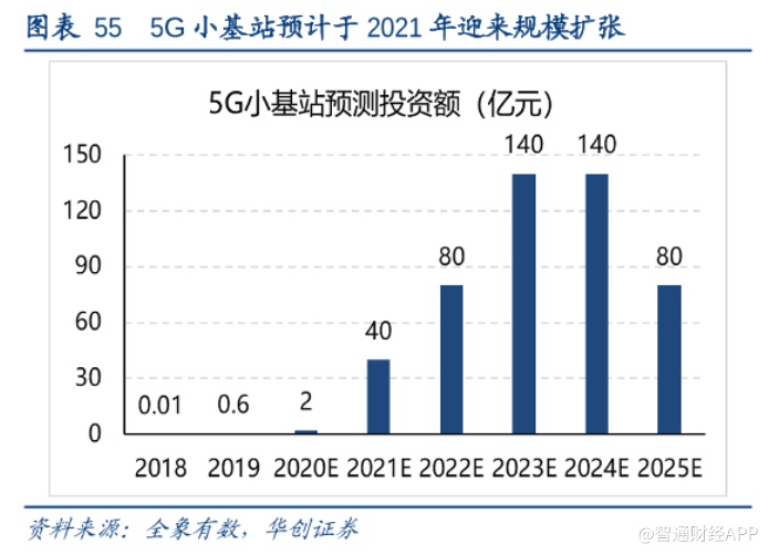 但智通财经APP认为,华创证券对于2020年的预测相对保守。近日,工业和信息化部分别向中国电信、中国联通、中国广电颁发了无线电频率使用许可证,同意三家企业在全国范围内共同使用3300-3400MHZ频段频率用于5G室内覆盖。三家企业通过5G室内接入网的共建共享实现了降本增效,这会使得小基站需求总量有所下调,但在建设的进度上,将加速小基站建设的释放。