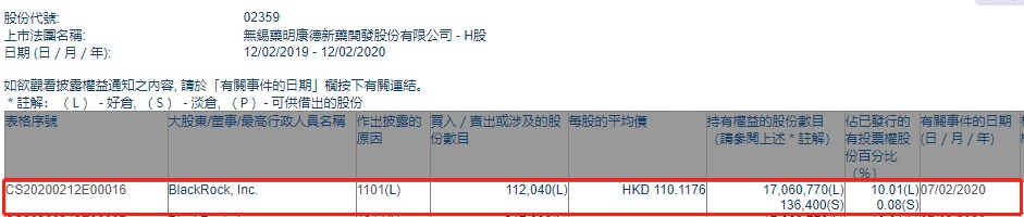智通财经APP获悉,联交所最新资料显示,2月7日,贝莱德增持药明康德(02359)11.204万股,每股作价110.1176港元,总金额约为1233.76万港元。增持后最新持股数目约为1706.08万股,最新持股比例为10.01%。