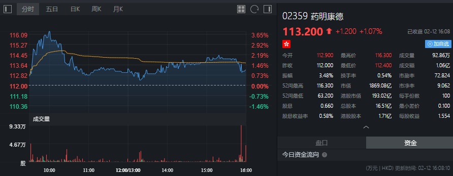截至今日收盘,药明康德(02359)涨1.07%,报113.20港元。